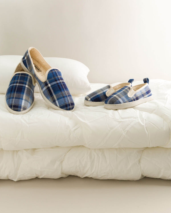 Pour matcher avec mini, craquez pour notre duo de chaussons homme & enfant en coton bio à imprimé tartan !