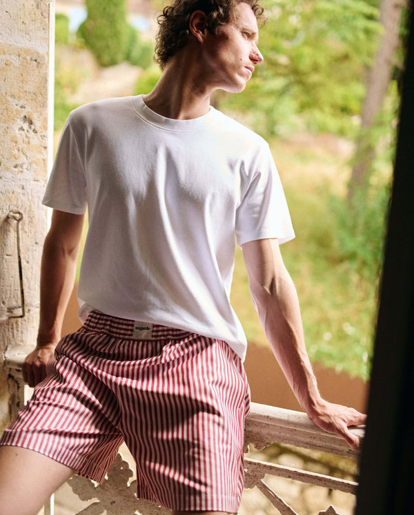Pour changer du noir, nous avons choisi six coloris joyeux qui permettent de convenir à tous les goûts : latte, ciel, citron, dahlia, marine et matcha. Le pyjashort femme, qui est le modèle disponible pour les femmes, présente ces mêmes couleurs. Notre short court homme taille normalement. Nous vous conseillons donc de prendre votre taille habituelle. Une table de correspondance de tailles est inscrite sur toutes les fiches produit de nos shorts homme. Le prix de notre short pyjama homme est de 55€ TTC. Il est disponible sur notre site internet et dans notre boutique au 80 rue d’Aboukir, 75002 Paris, de la taille S au XL. Sur notre e-shop, les frais de livraison sont offerts dès 90€ d’achat.