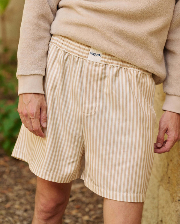 Pour réaliser cela, nous nous sommes inspirés des shorts de sport, en particulier du short de boxe, en y ajoutant le macaron Angarde au centre de la ceinture. De plus, le choix d'un tissu à rayures colorées vise à évoquer l'esprit du homewear, apportant une touche de style et de gaieté à cette pièce. Notre objectif est de vous offrir un short de nuit homme qui va au-delà de sa fonction première, alliant le confort d'un vêtement de nuit à l'élégance d'une tenue d'intérieur, à un prix accessible, et disponible dans des couleurs variées.