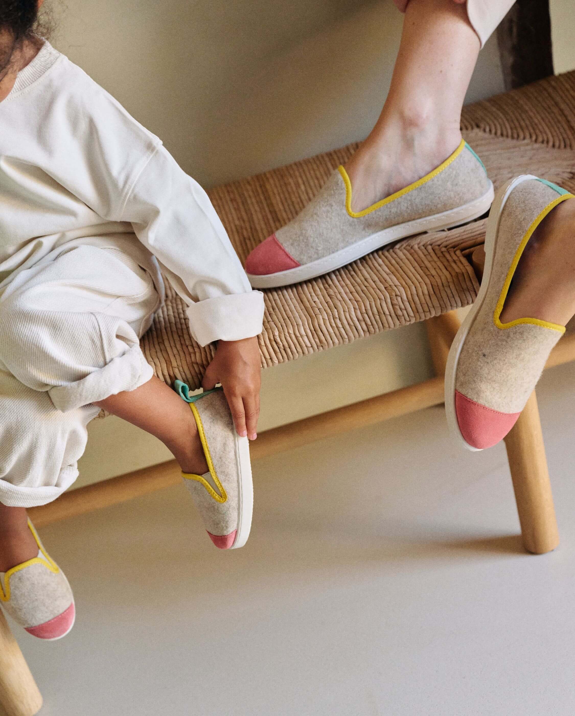 Children’s slipper in recycled beige wool with a pink patch and yellow piping.