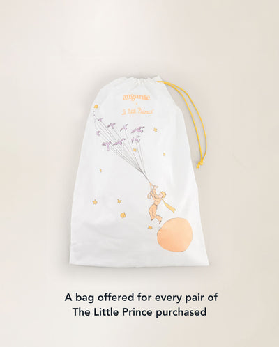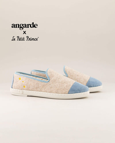 Women's slipper in beige recycled wool, with a sky blue suede leather insert and a "cloud" Little Prince print on the back.