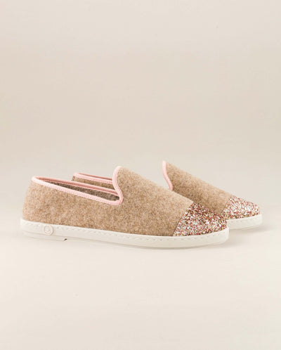 Camel Italian recycled wool slippers with pink glitters for front and back yokes.