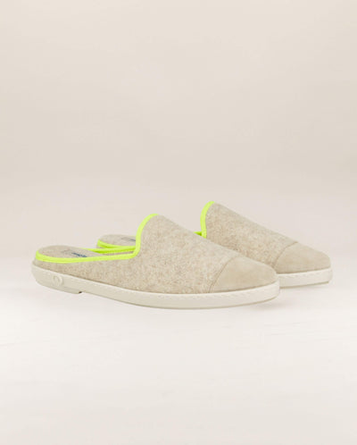 Beige Italian recycled wool mules with fluorescent yellow piping, for men.