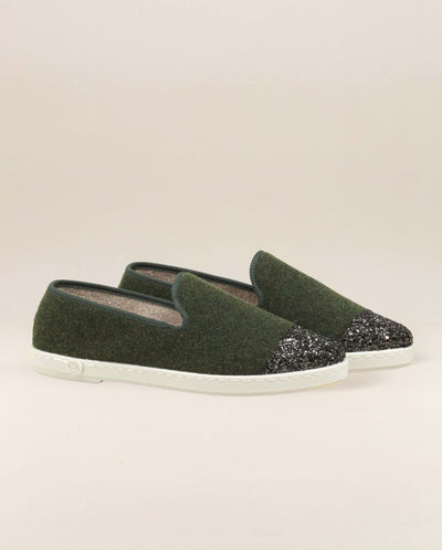 Dark green Italian recycled wool slippers with green glitter fabric for front and back yokes.