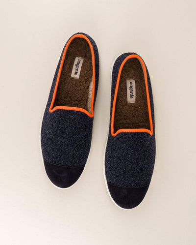 Navy Italian recycled wool slippers with orange piping.