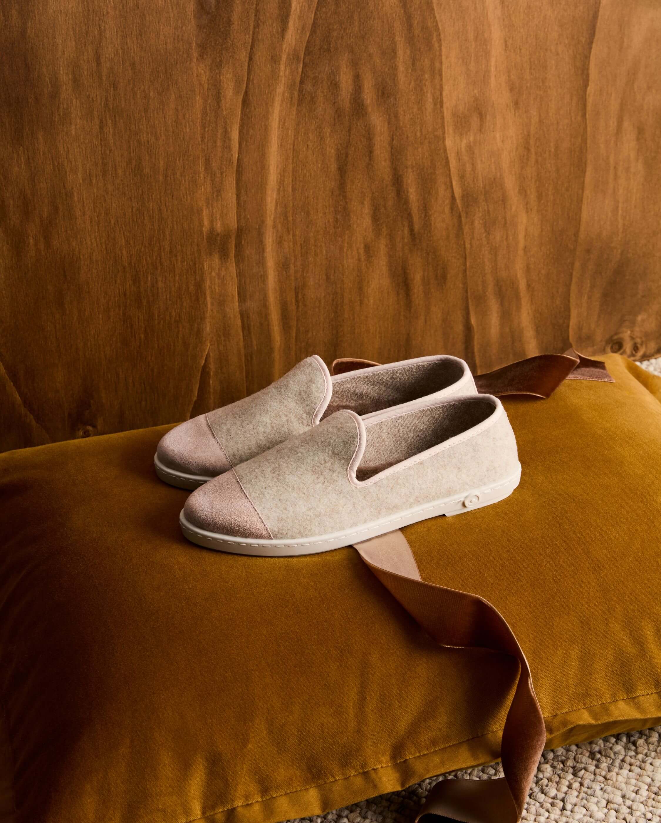 Beige Italian recycled wool slippers with baby pink inserts for front, back yokes and piping.