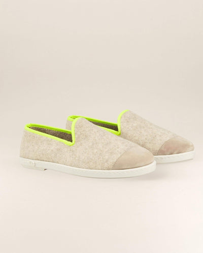 Beige Italian recycled wool slippers with fluorescent yellow piping, for men.