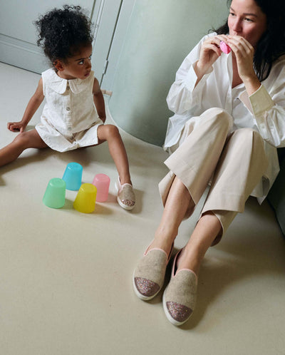 Chausson enfant en laine recyclée beige à l'empiècement pailletté