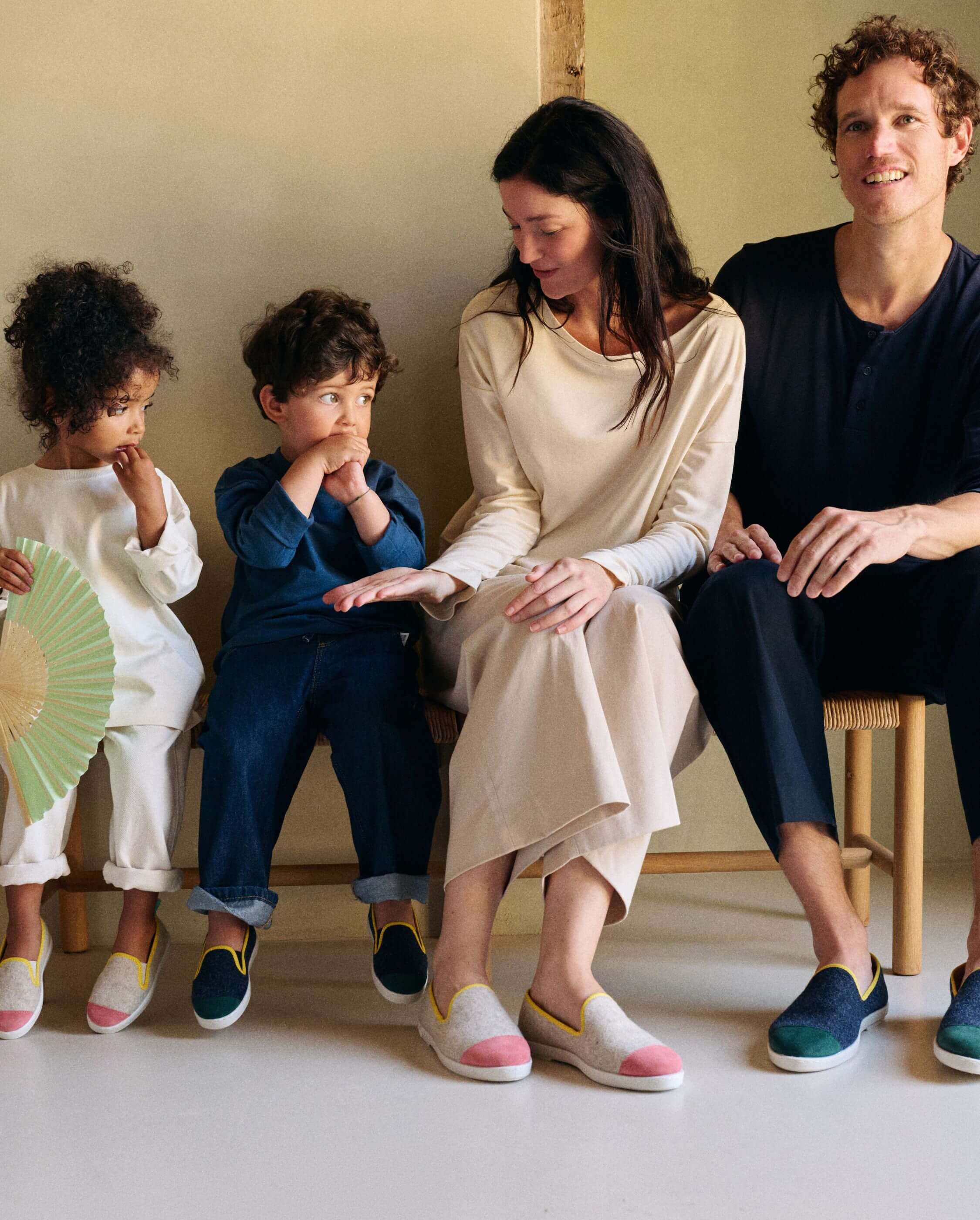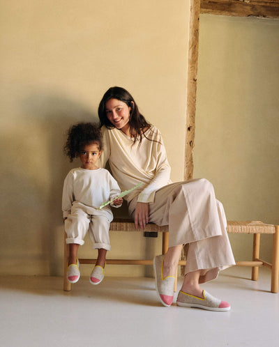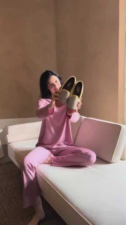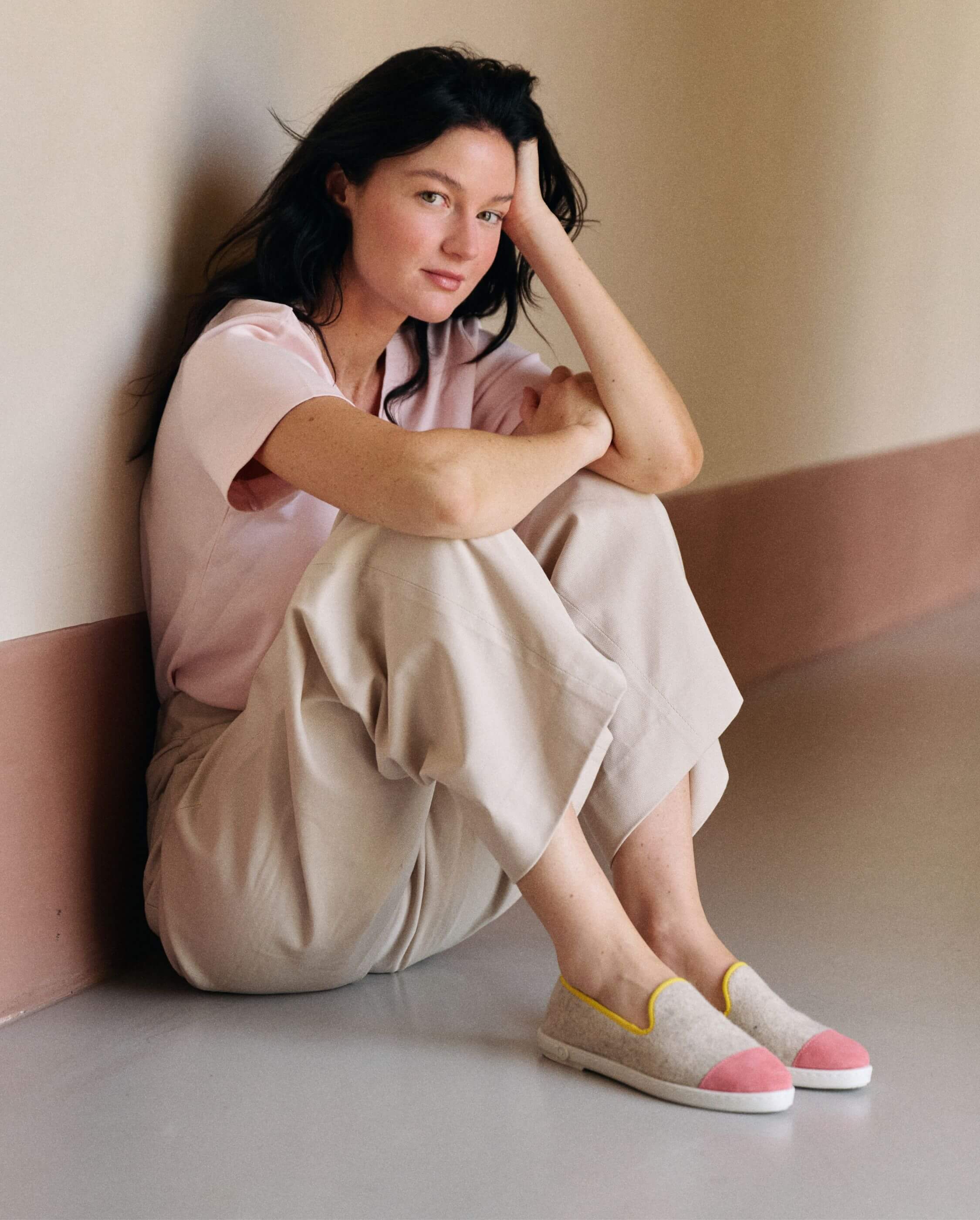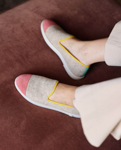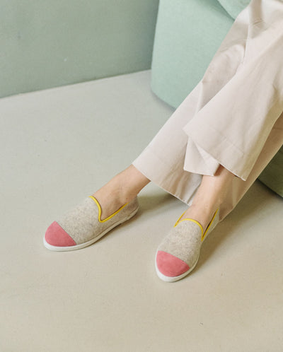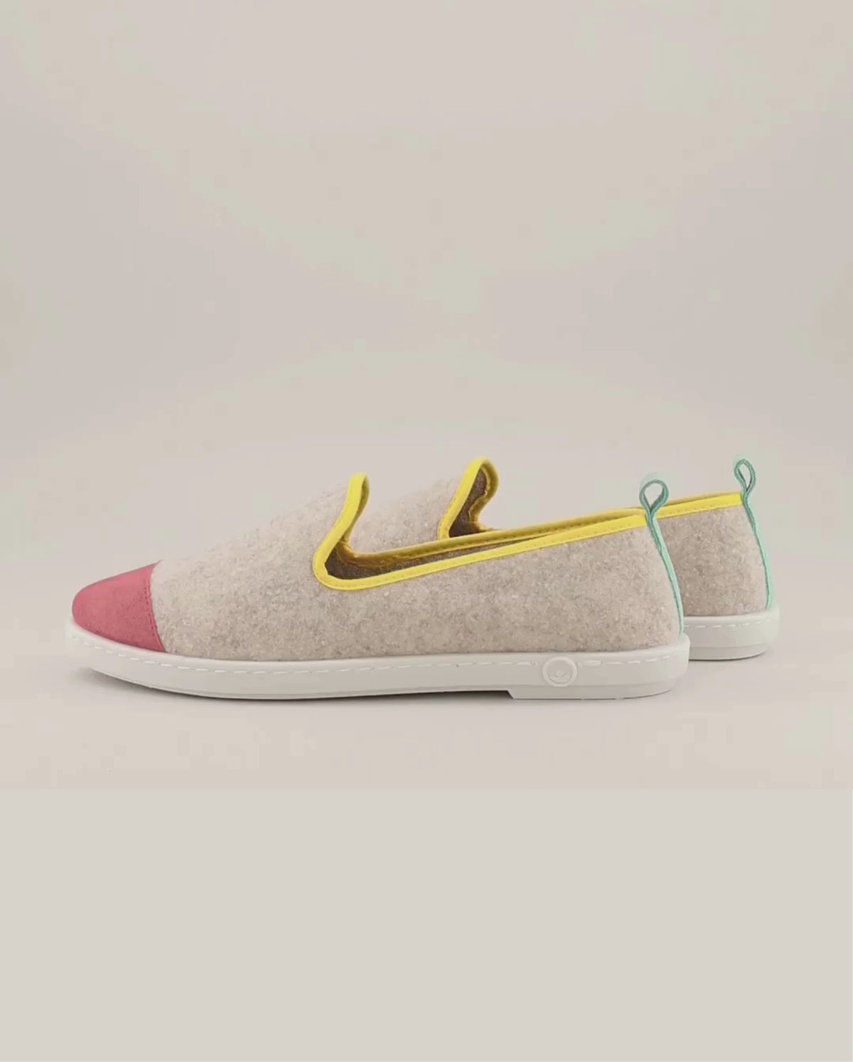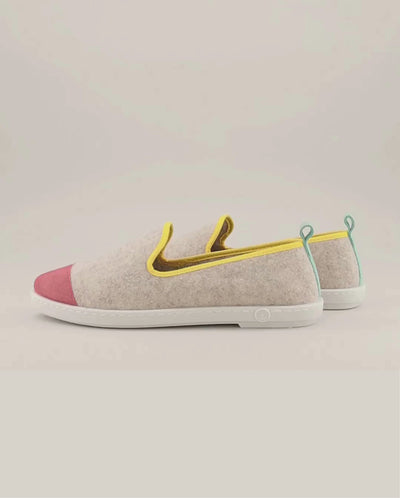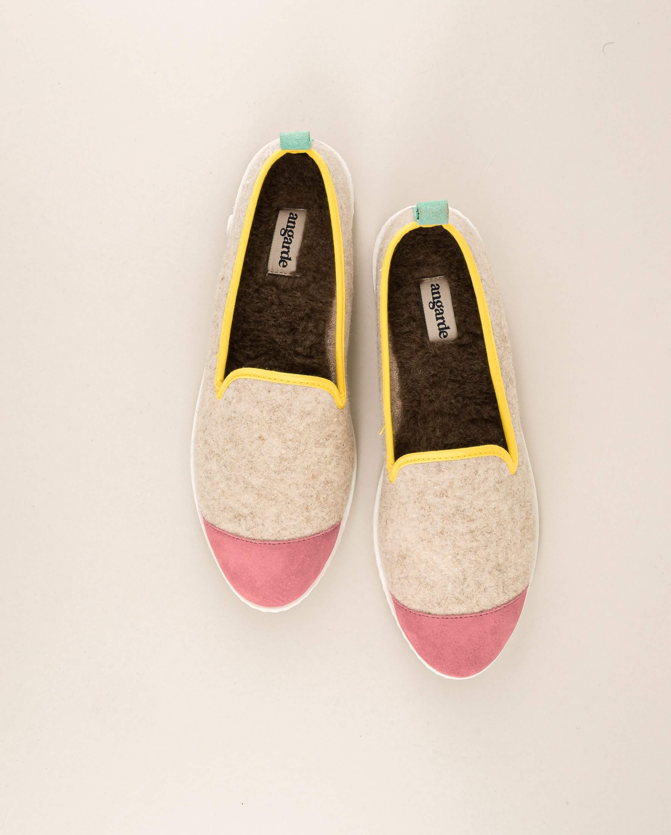 Chausson femme en laine recyclée beige à l'empiècement rose et au passepoil jaune et à l'empiècement rose.