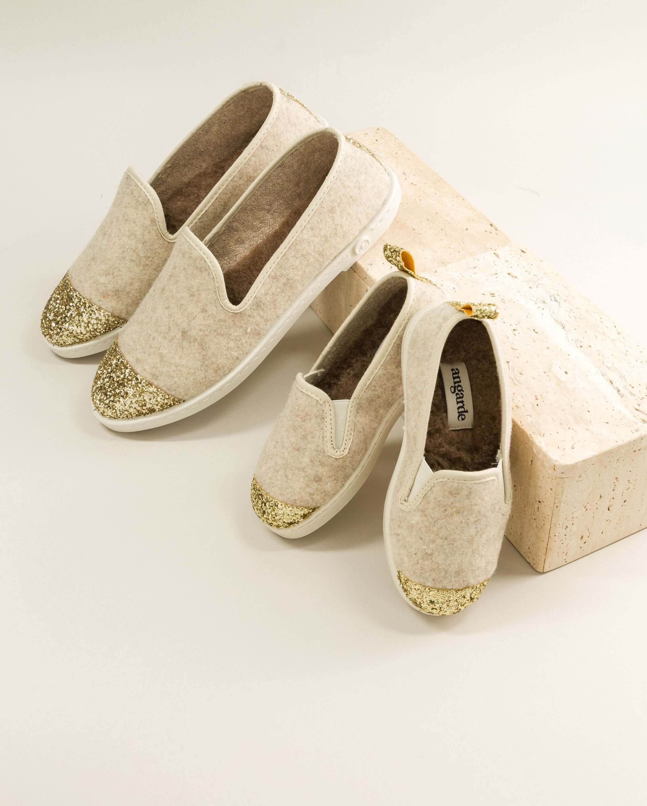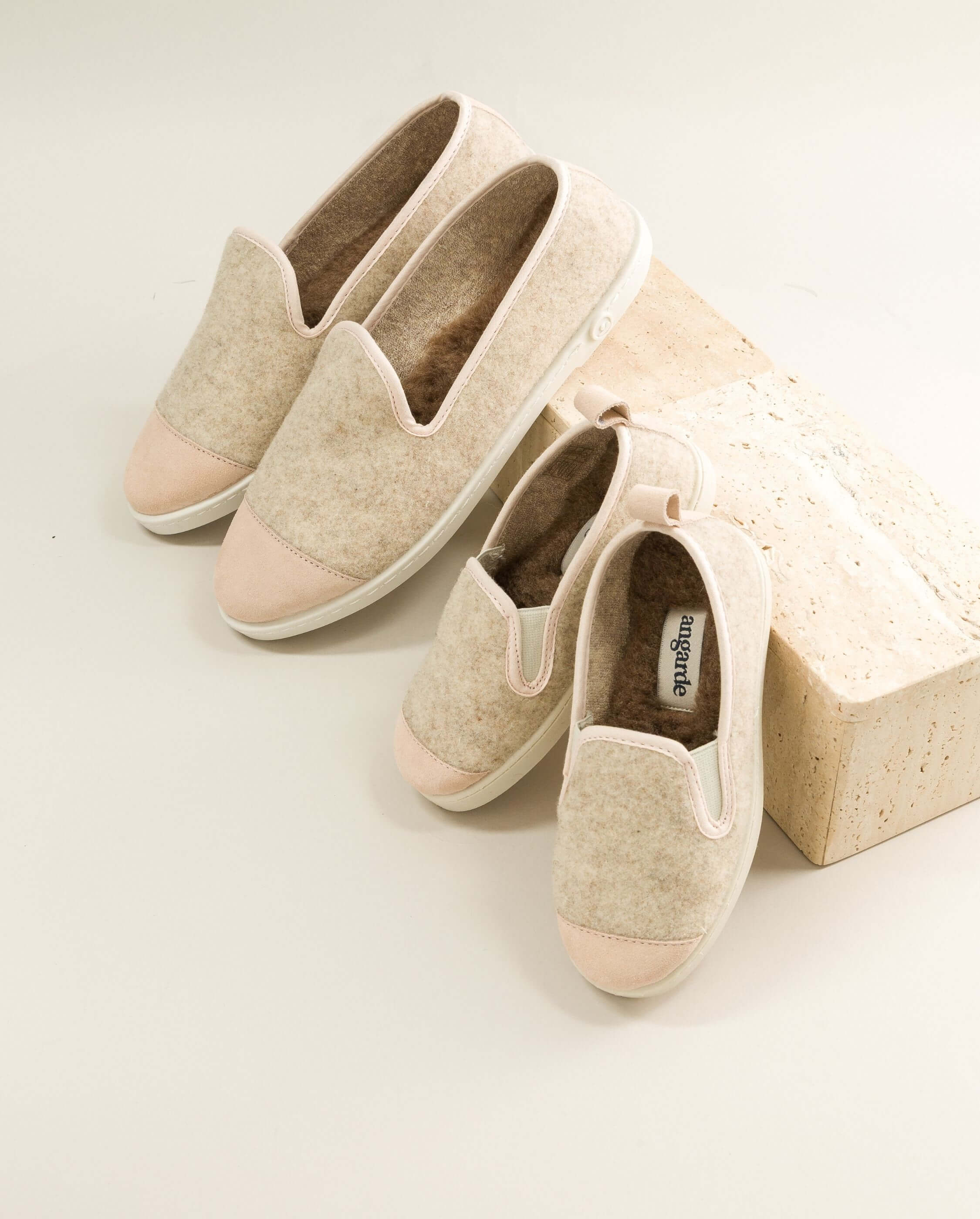 Duo de chaussons pour femme et enfant en laine recyclée beige au passepoil jaune fluo