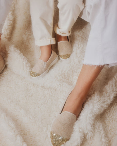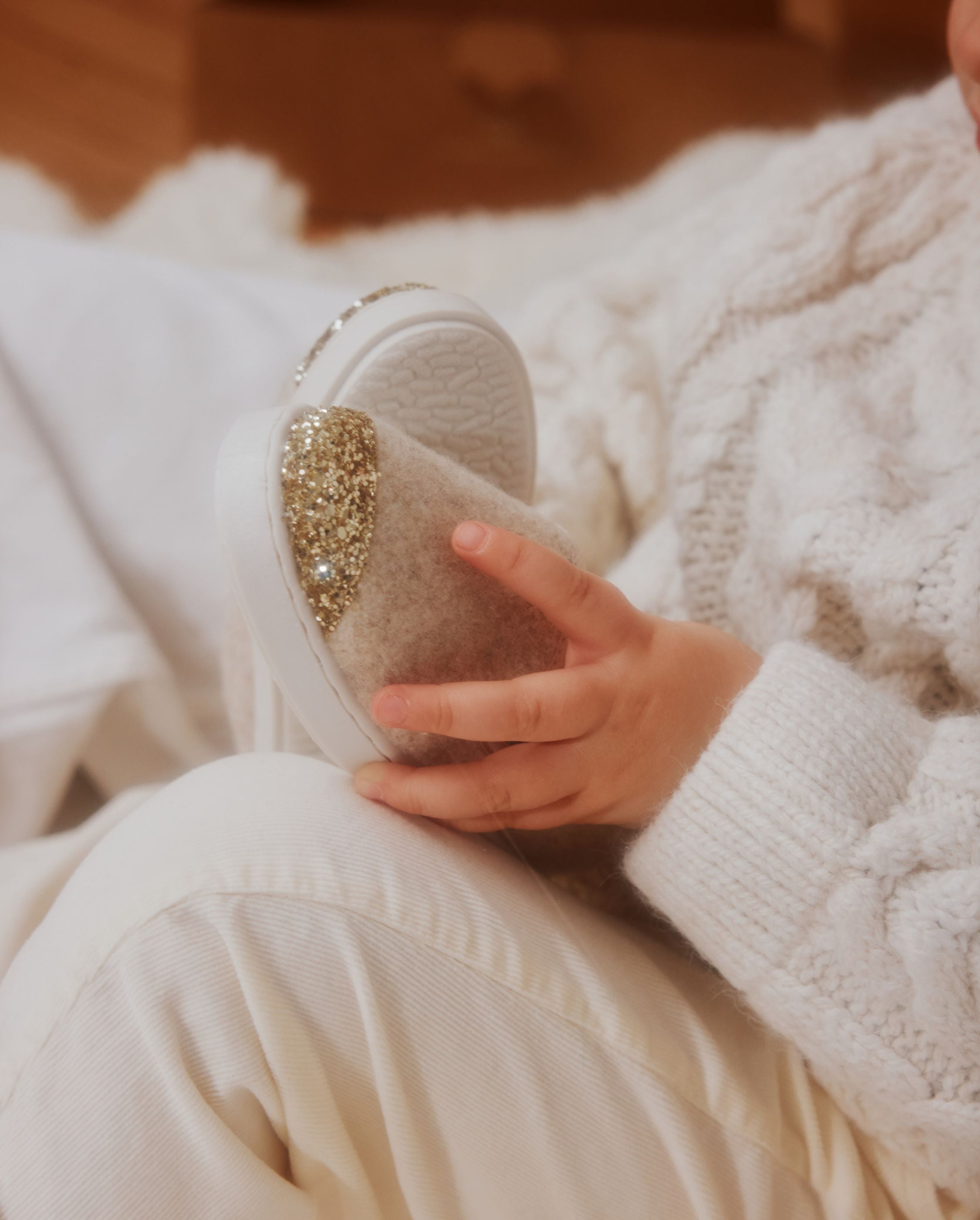 Duo de chaussons pour femme et enfant en laine recyclée beige et à l'empiècement pailleté.