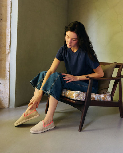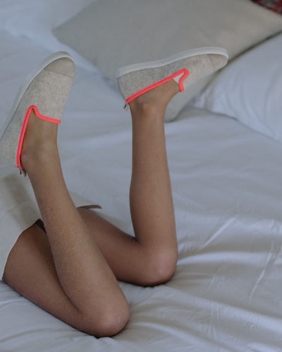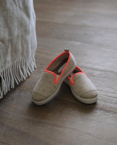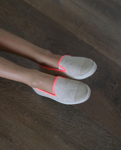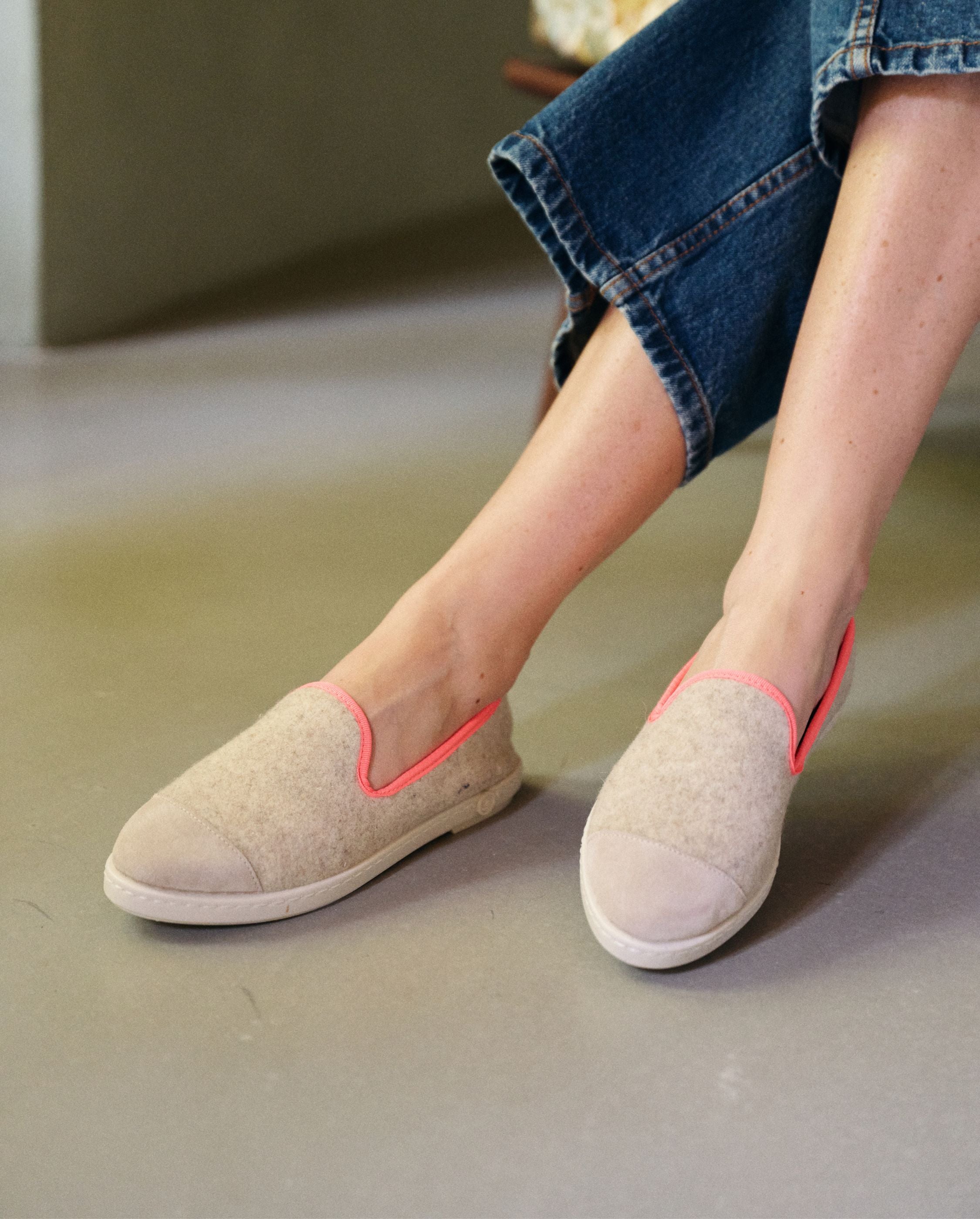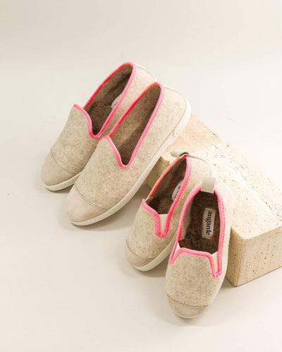 Duo de chaussons pour femme et enfant en laine recyclée beige au passepoil rose fluo