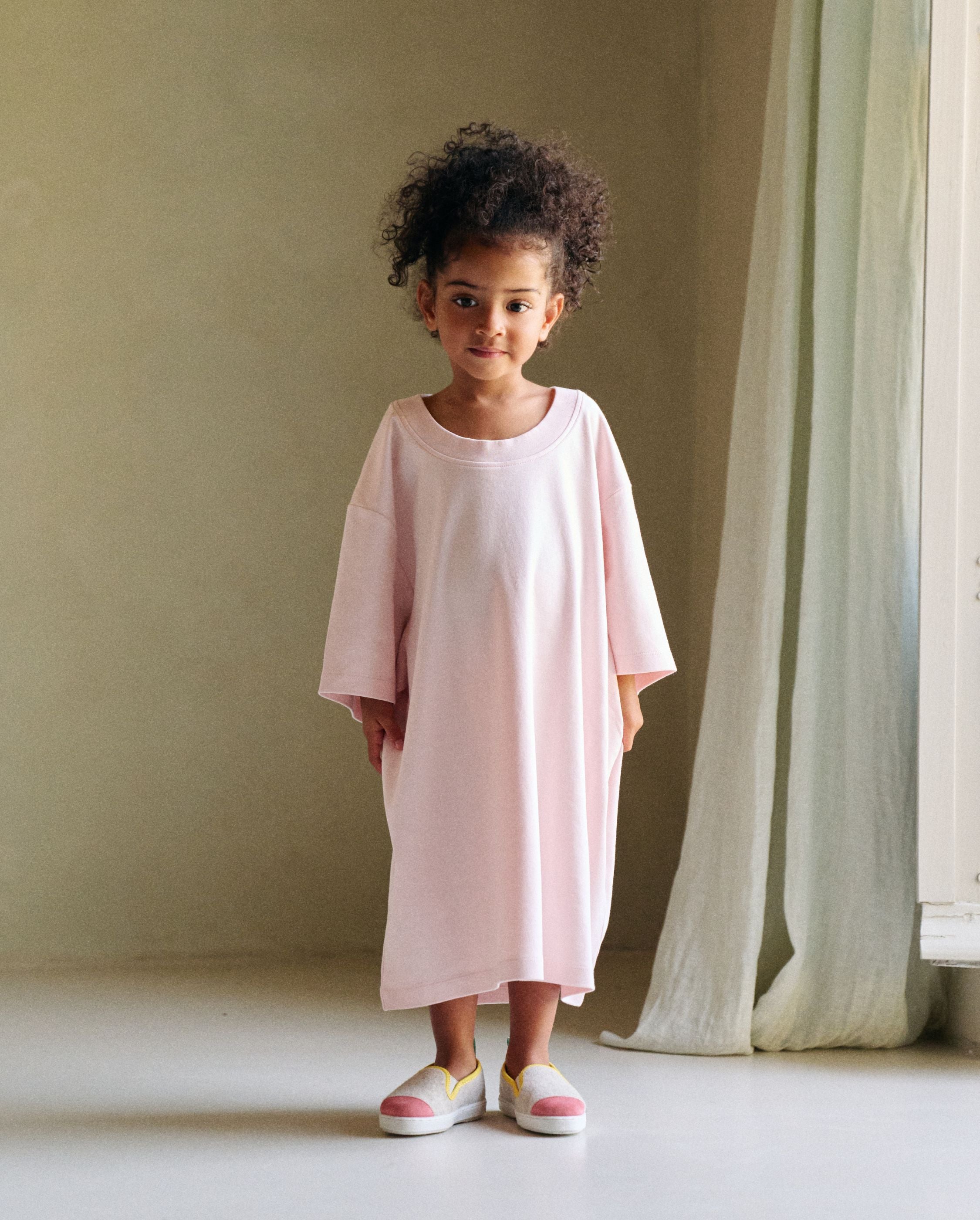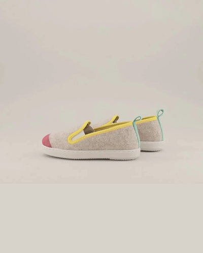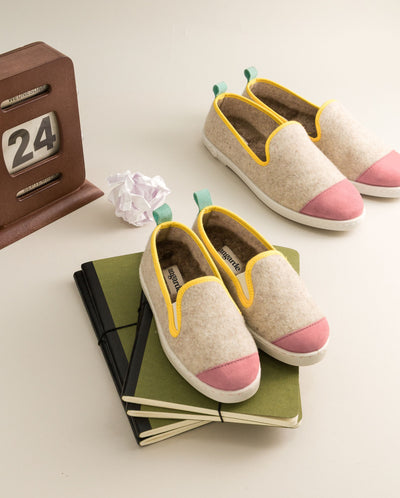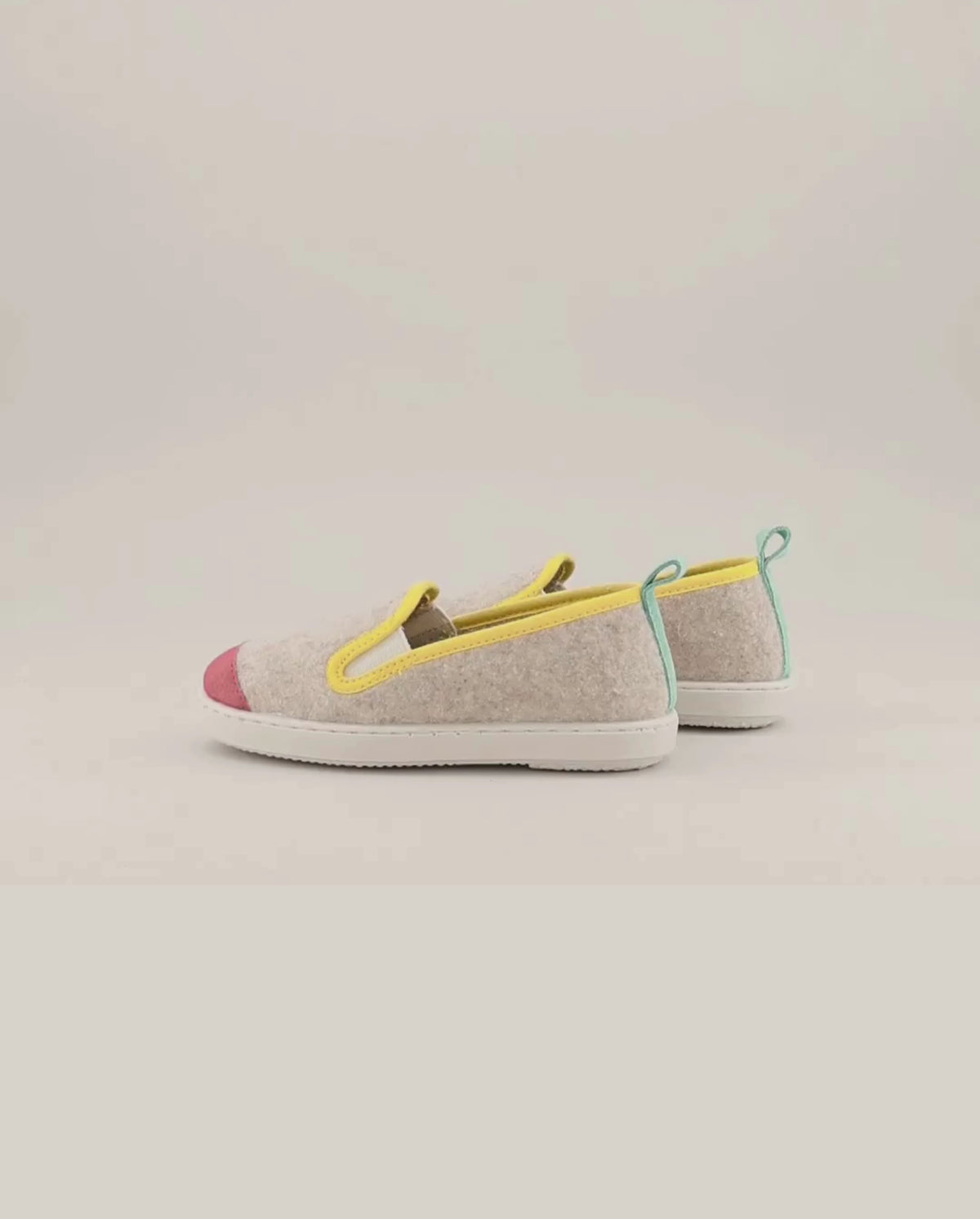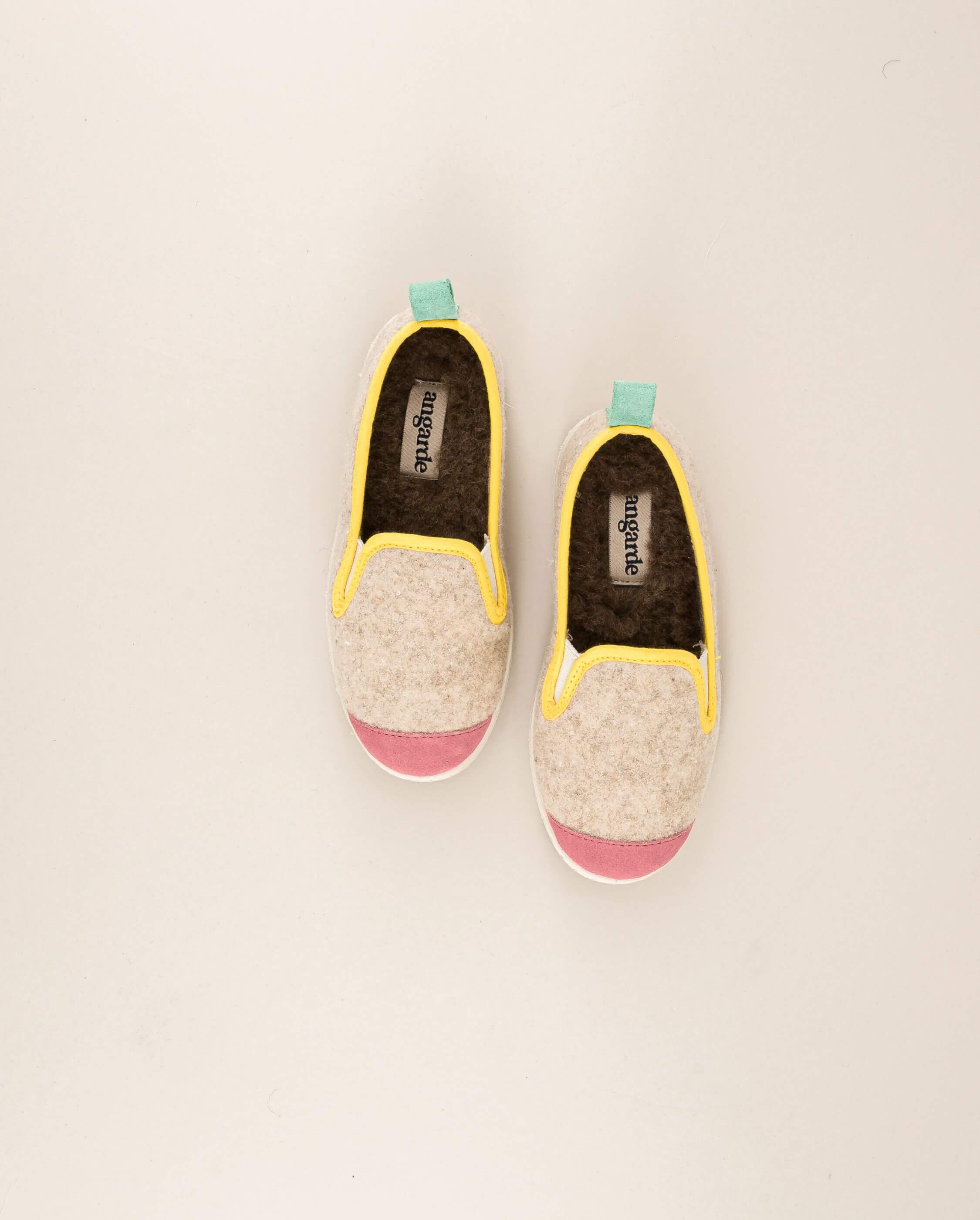 Duo de chaussons pour homme et enfant de la capsule "Play" en laine reyclée beige, au passepoil jaune et à l'empiècement rose.