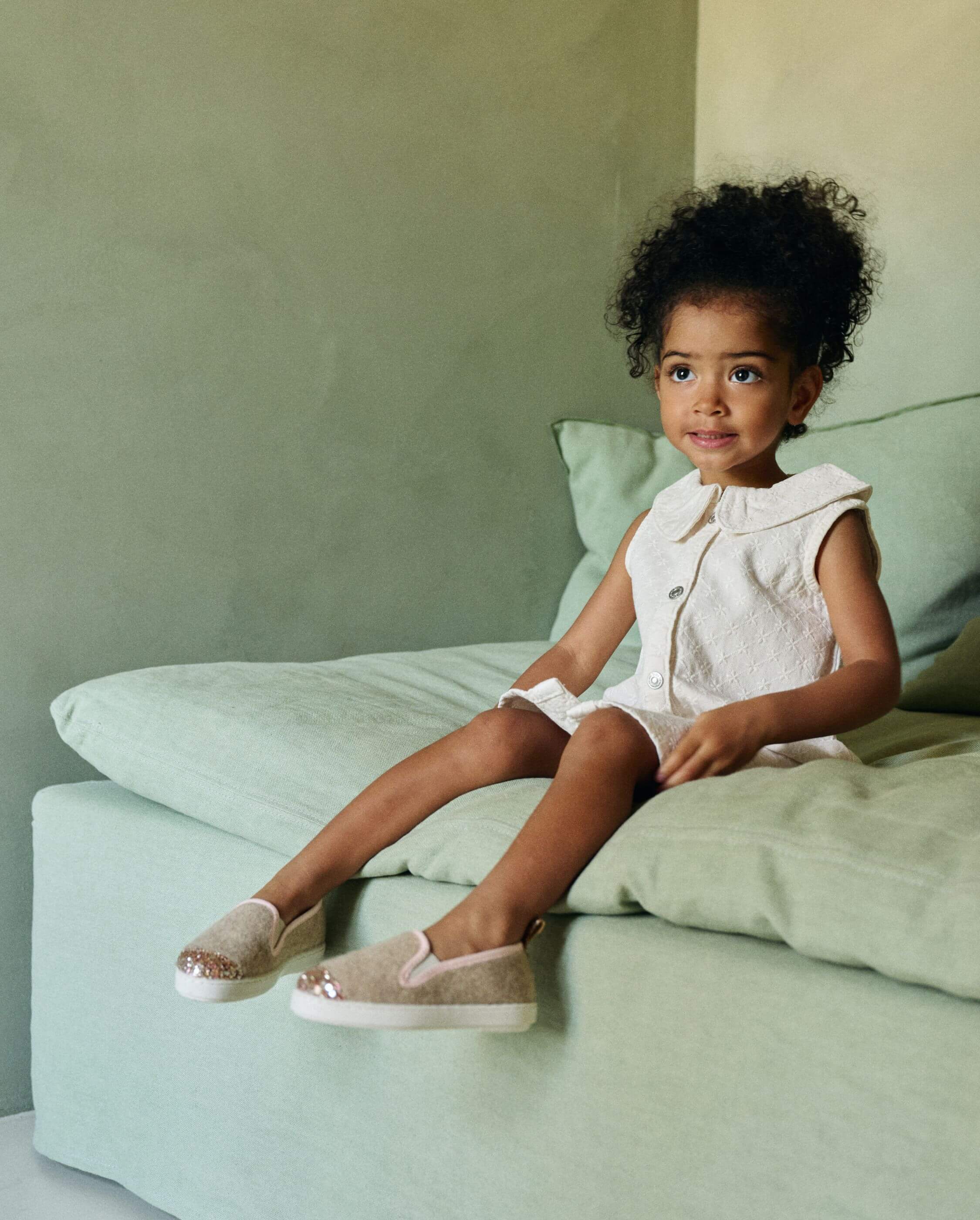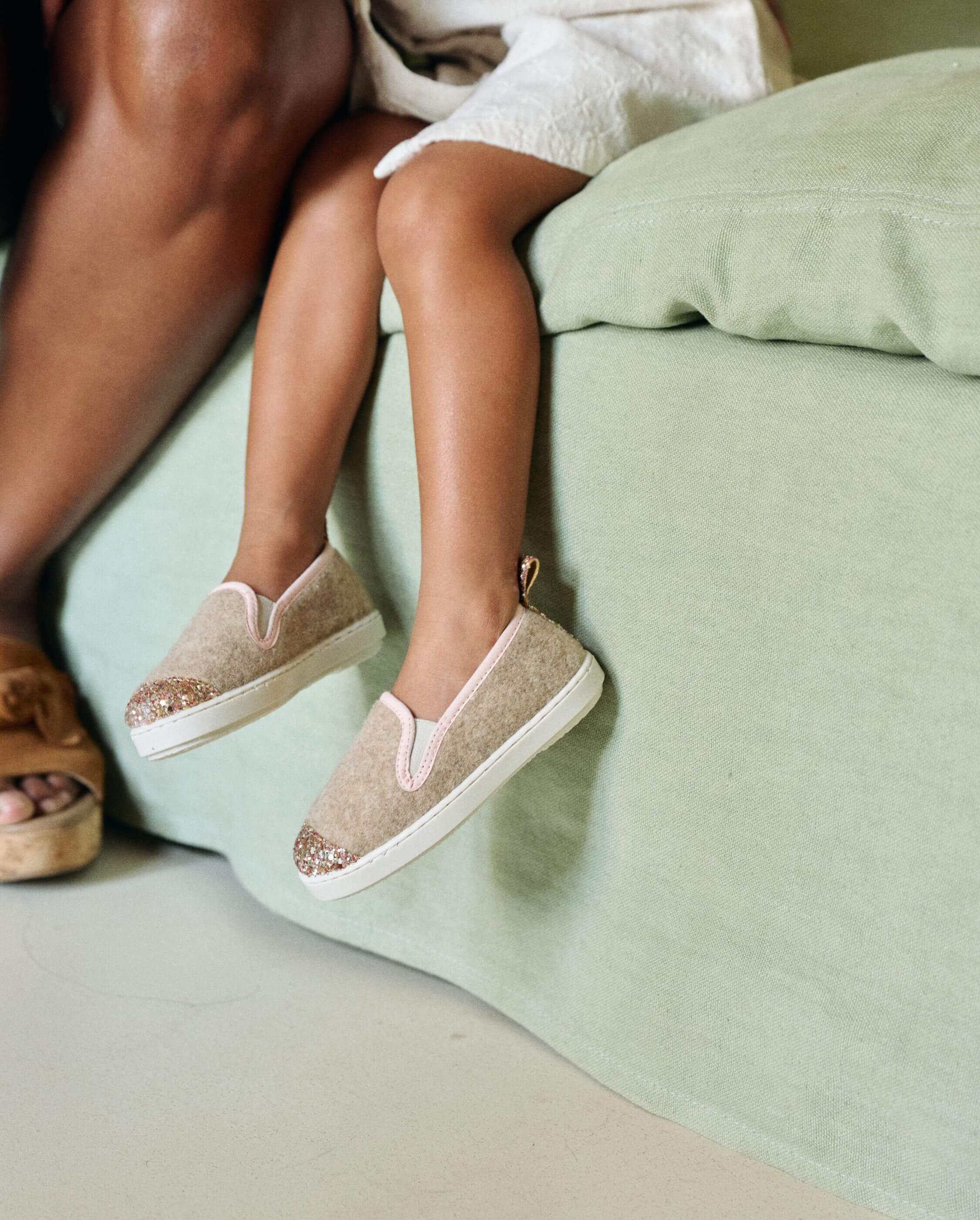 Duo de chaussons pour femme et enfant en laine sable et à l'empiècement pailleté.