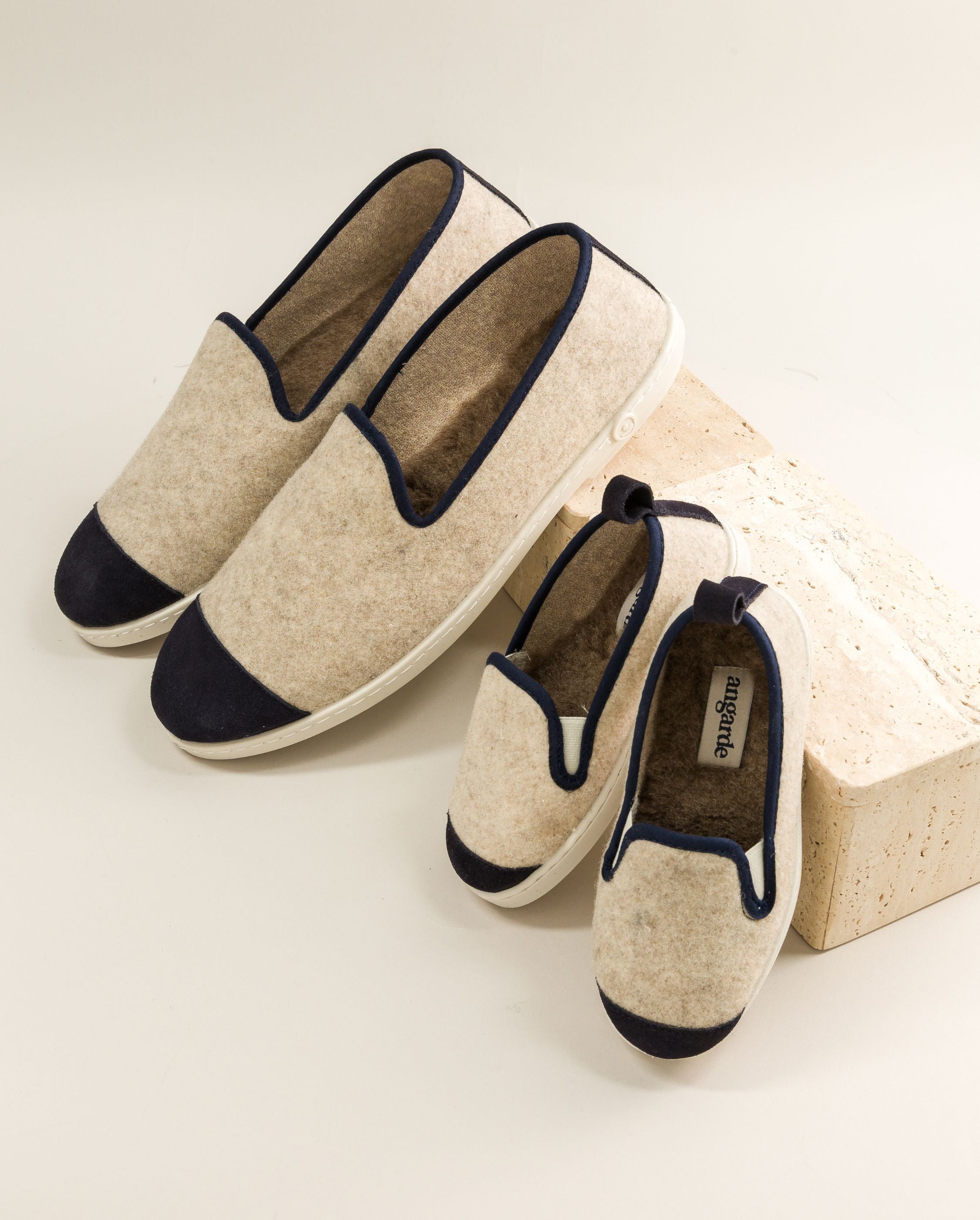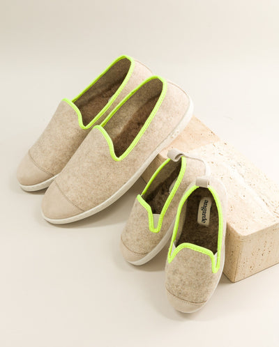 Duo de chaussons pour homme et enfant en laine recyclée beige au passepoil jaune fluo