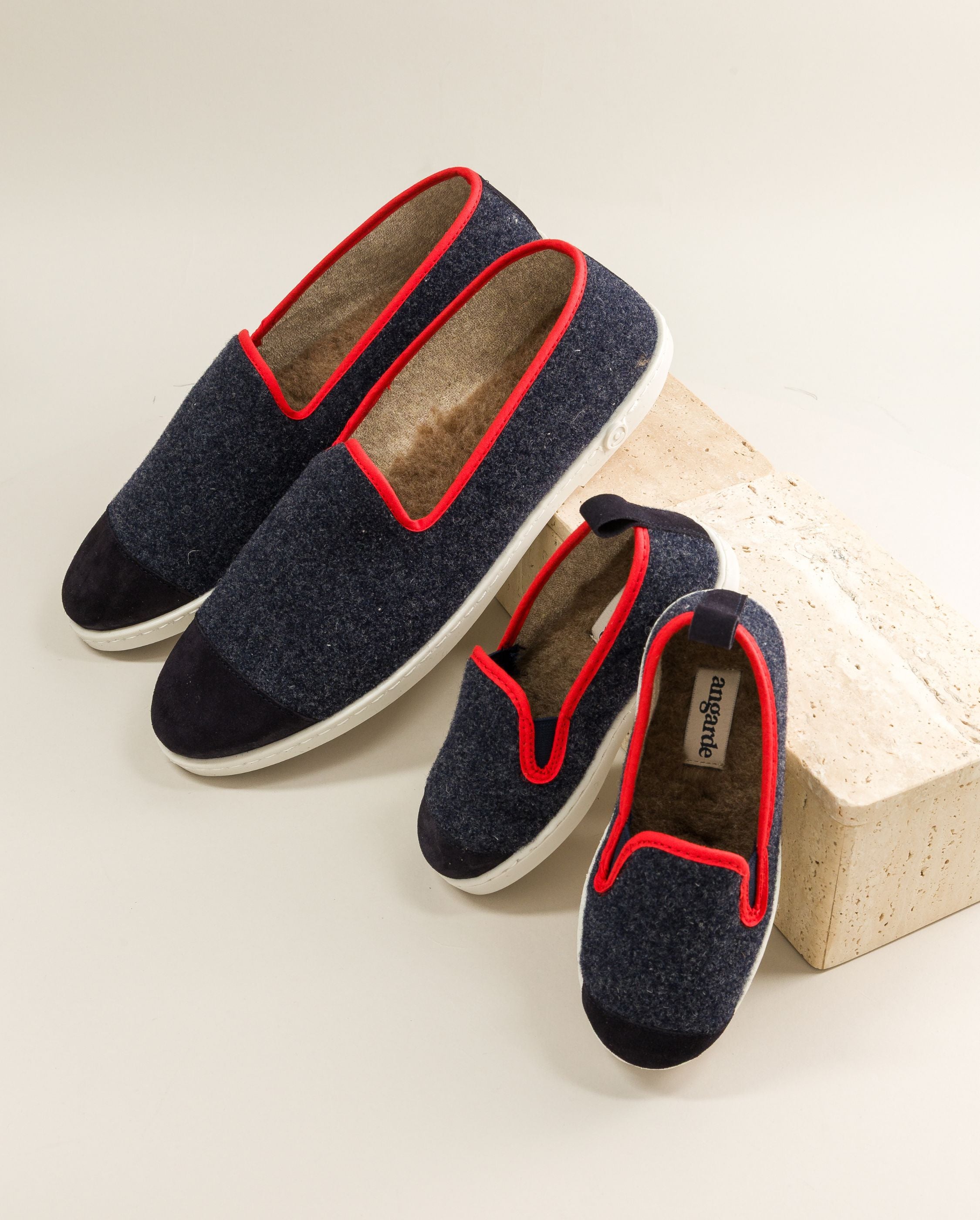 Duo de chaussons pour homme et femme en laine au passepoil bleu nuit