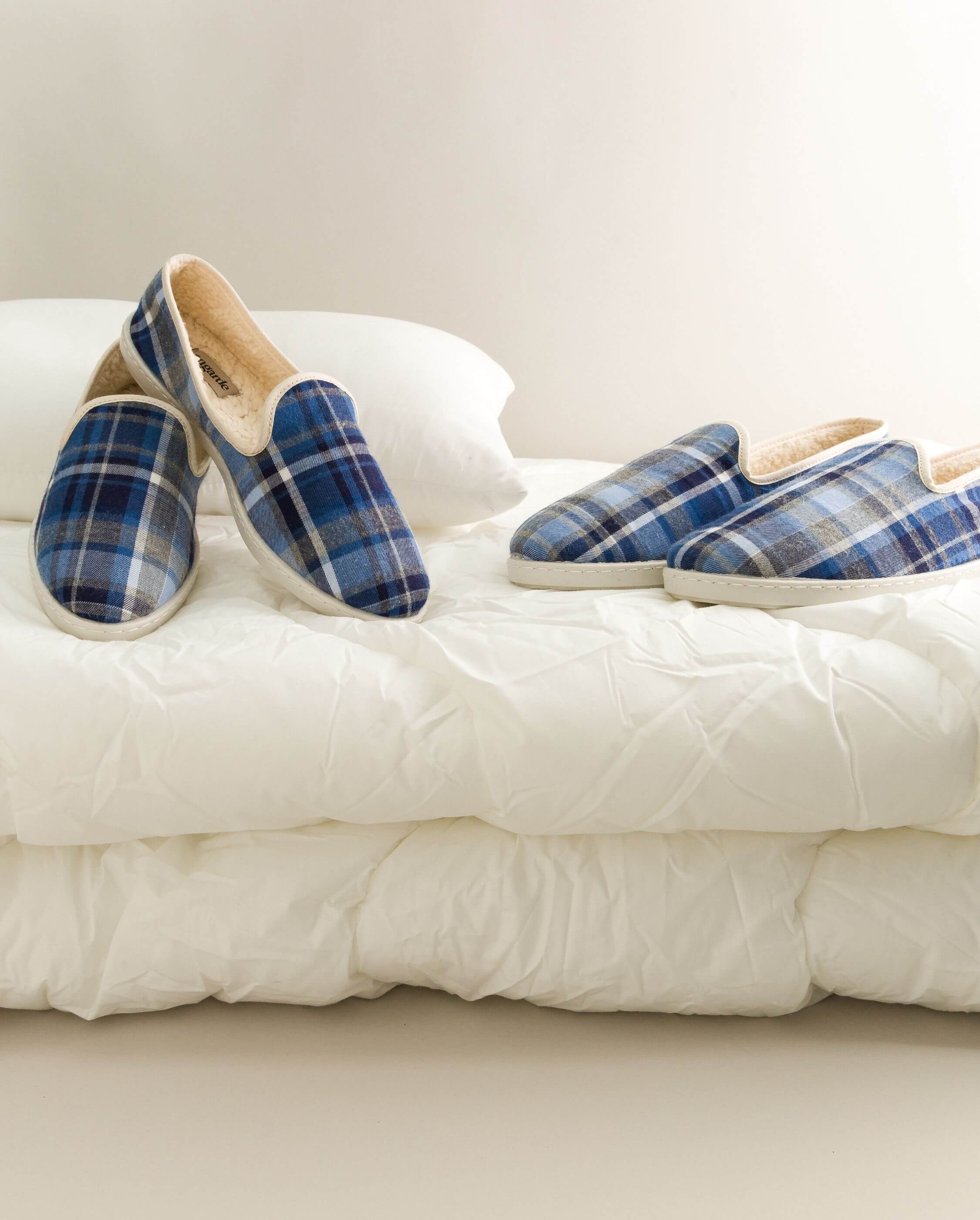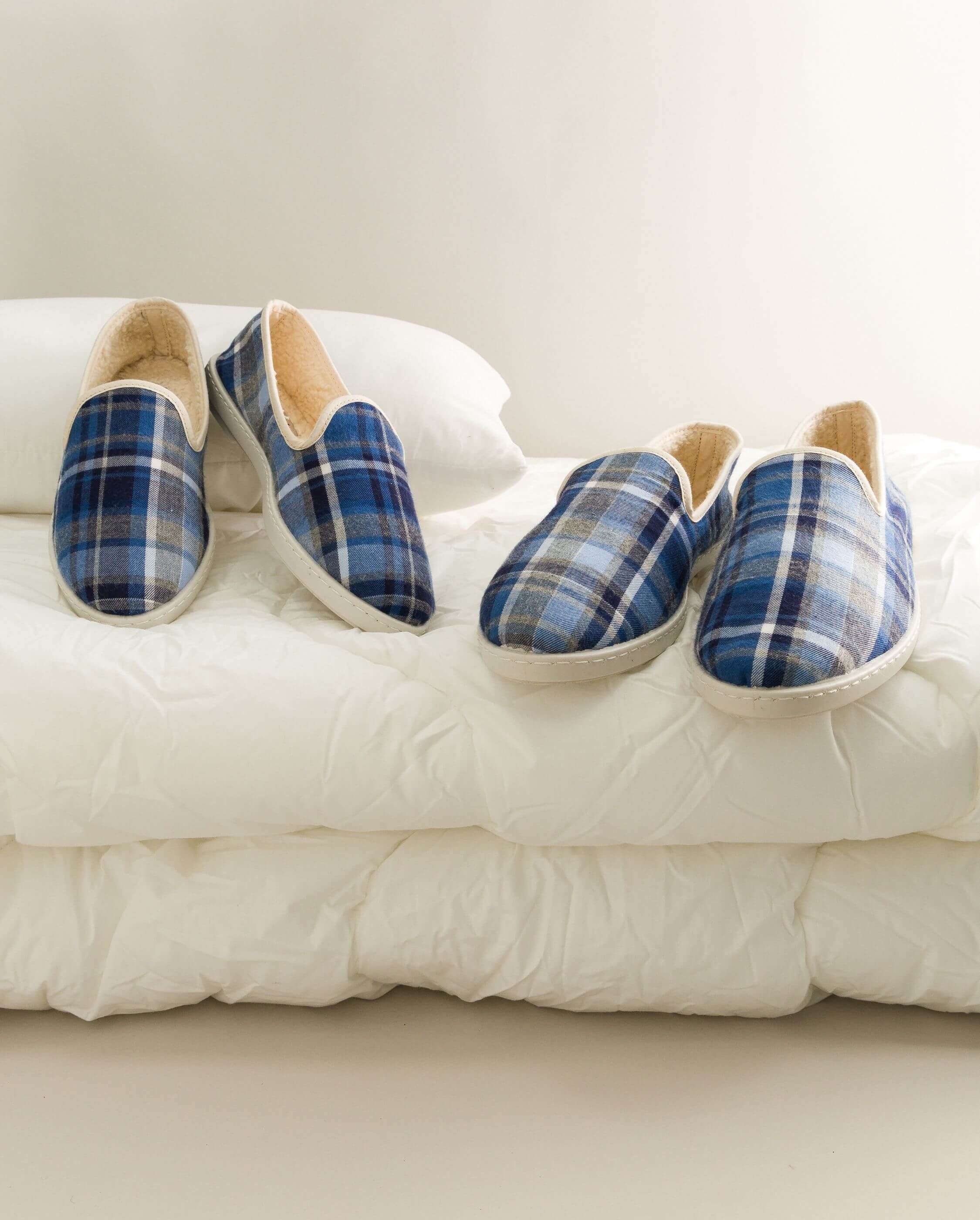 Duo de chaussons pour homme et femme en coton bio avec imprimé tartan bleu