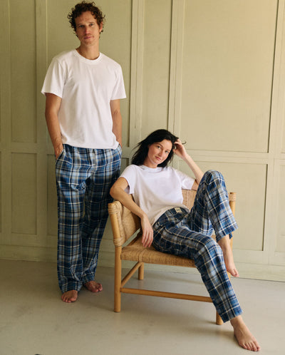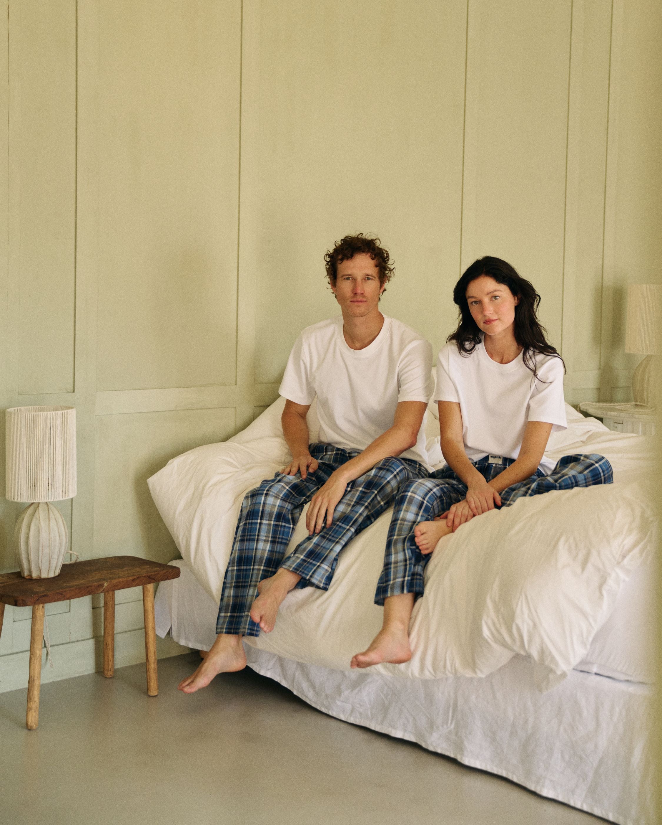 Ensemble pantalon en coton bio à imprimé tartan + t-shirt en coton bio marine pour homme (taille unisexe)