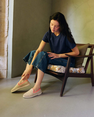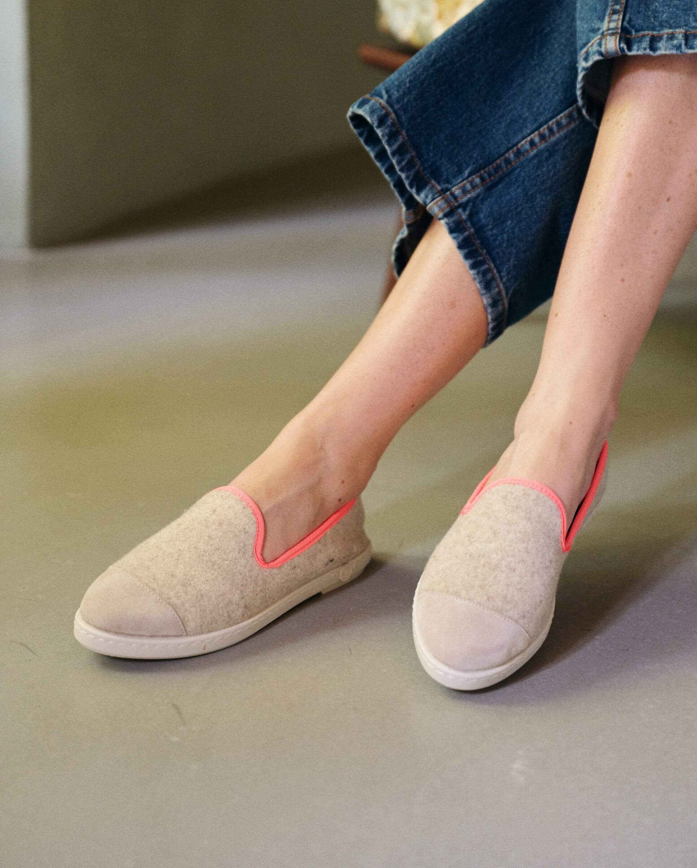 Chausson femme en laine recyclée beige au passepoil rose fluo