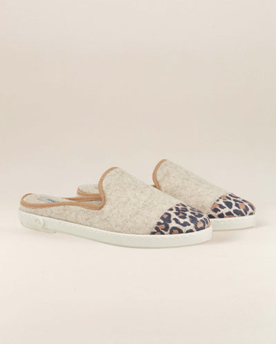 Mule femme en laine recyclée beige à l'empiècement léopard