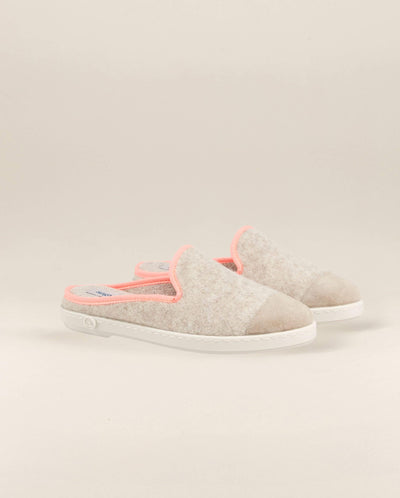 Mule femme en laine recyclée beige au passepoil rose fluo